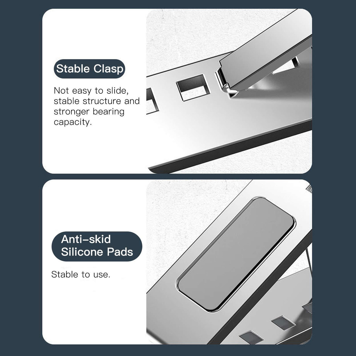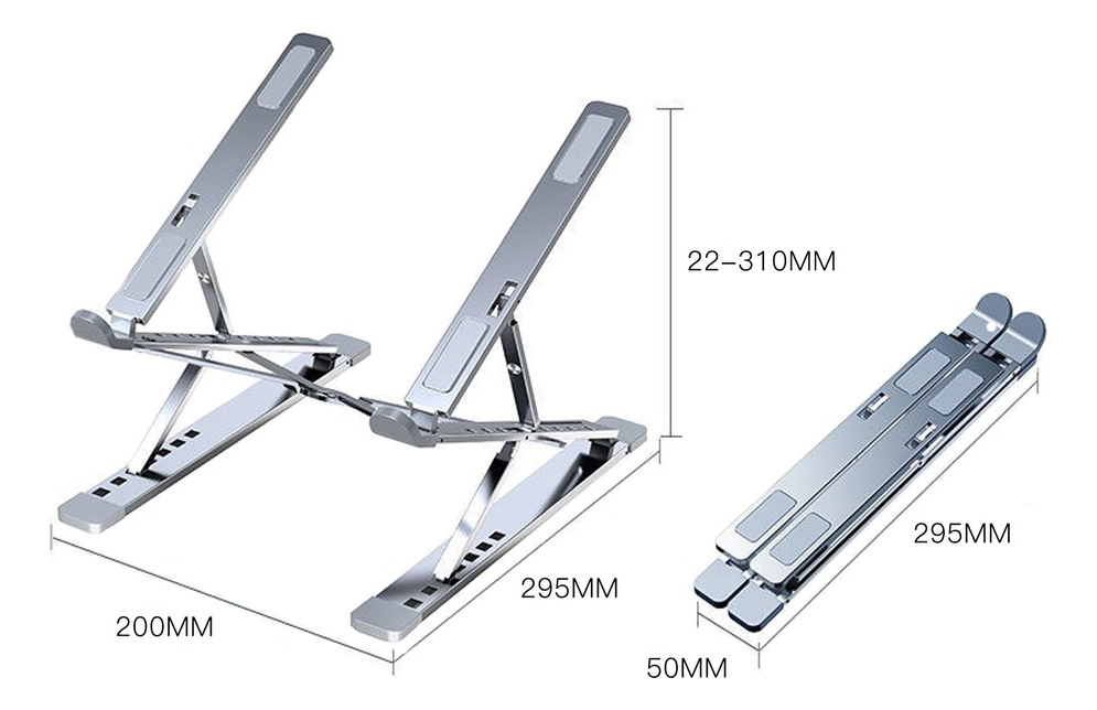 • Portátil y plegable: el soporte para portátil está hecho de aleación de aluminio y presenta un diseño plegable que es compacto y fácil de almacenar.
