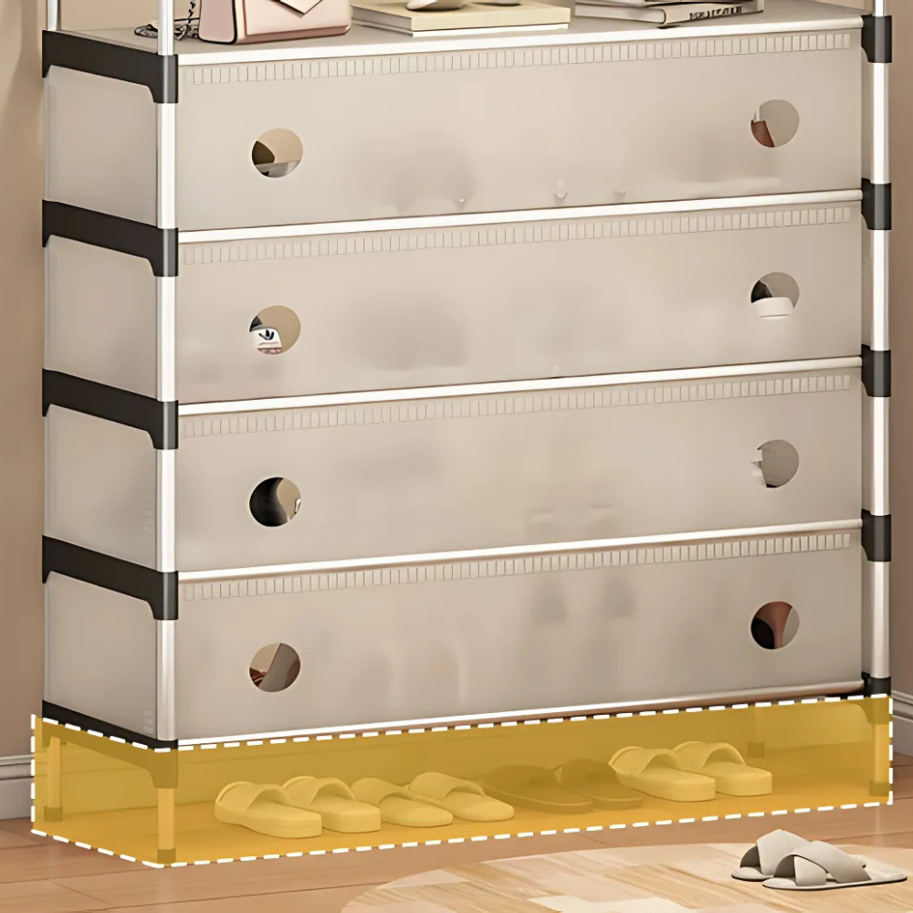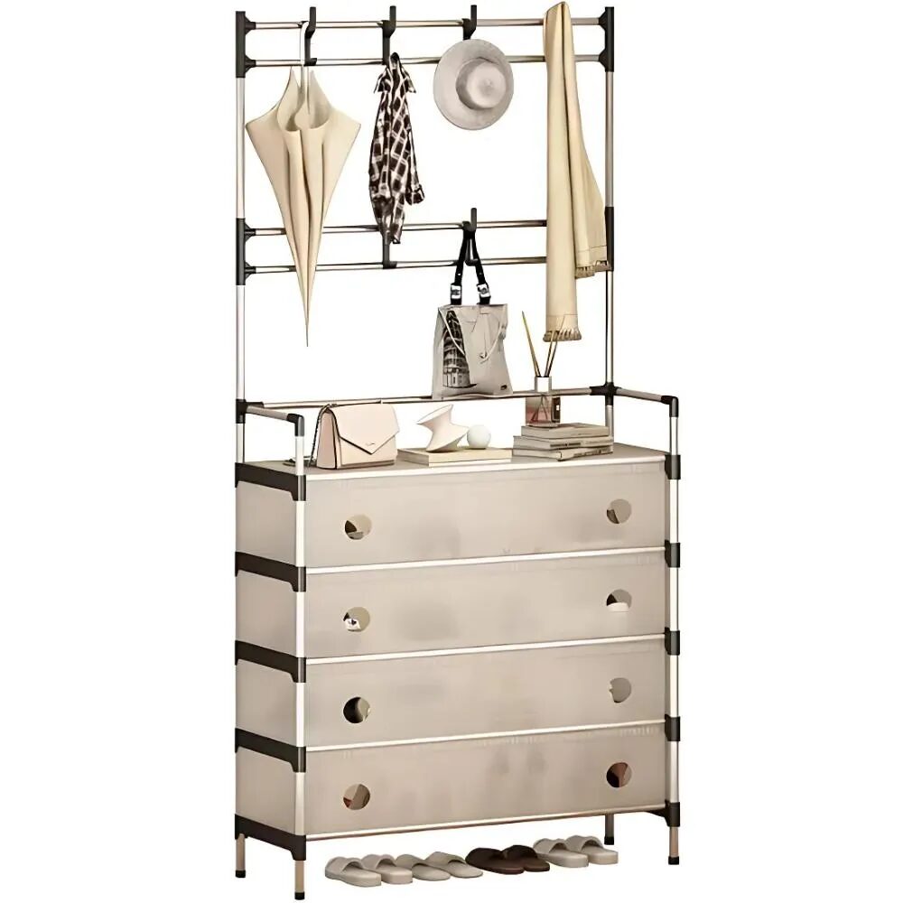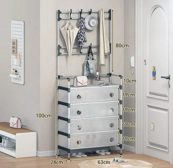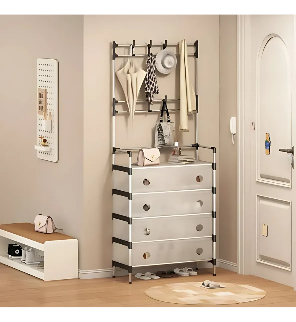 • Estructura combinada: Incluye un perchero superior con ganchos para colgar bolsos, sombreros, chaquetas y otros accesorios.